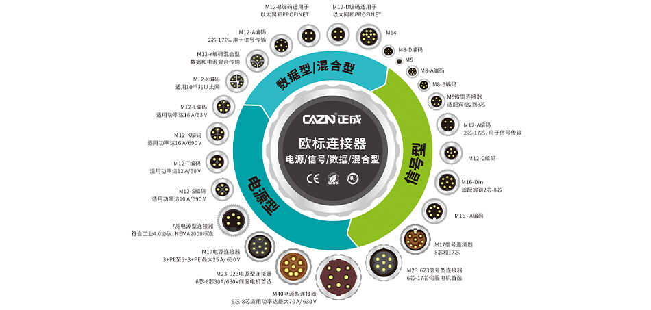 M12连接器直径为12毫米,按IEC 61076-2-101标准制造,常见的编码有A、B、D、X、L等,可满足不同信号、电源与数据传输需求。其主要特点包括: